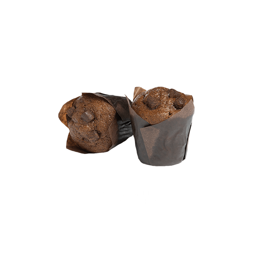 Mini muffin de chocolate con trozos de chocolate (6%). Una presentación elegante y apetitosa, que realza cualquier buffet y acompaña perfectamente al café.